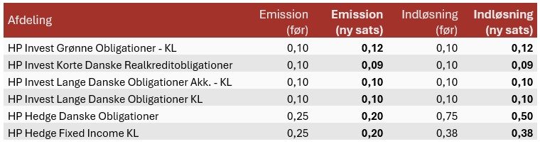 Den 12. januar 2026 ændres emissionstillæg og indløsning fradrag for flere af HP Invest og HP Hedge afdelingerne.